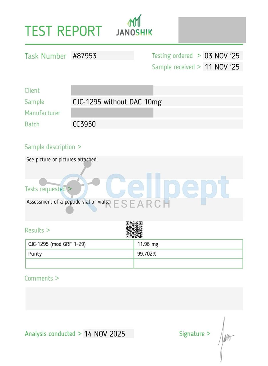 CJC-1295 (No DAC) is a synthetic peptide studied for its ability to stimulate growth hormone (GH) release through activation of growth hormoneβreleasing hormone (GHRH) receptors. In scientific research, the no-DAC variant is of particular interest due to its short half-life, allowing for more controlled and time-specific GH signaling studies. It has been explored in research related to growth hormone dynamics, metabolic regulation, recovery processes, and endocrine system function.